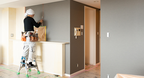 主に壁の取り付けや壁紙や床のフローリングなどの貼り付け、天井の仕上げなどの工事をします。